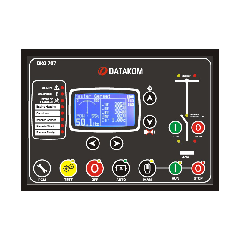 The DKG-707 is a comprehensive Manual and Remote Start unit for multiple generating sets operating in parallel with load sharing.The unit supports both diesel and gas gensets based on electronic and non-electronic engines. Up to 8 gensets may be combined together using DKG-707 units without the need for extra modules. The communication between modules is made with the Datalink connection.
