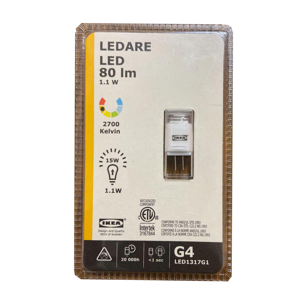 Non dimmable. Couleur claire; blanc chaud (2700 Kelvin). S’allume directement à la mise sous tension. Durée de vie des LED env. 20.000 heures. IKEA. Modèle LED1317G1. Classe d’efficacité énergétique : A++. Consommation d’énergie : 2 kWh/1000 h..